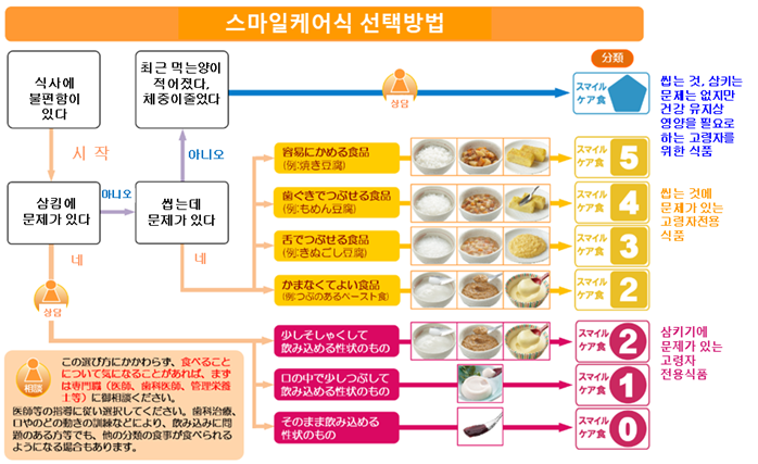 다양한 개호식품이 시장에 나와있는 가운데 소매점등에서 상품을 선택할 때에, 각 개개인의 상태에 따라 「스마일 케어식」을 혼동 없이 선택할 수 있도록, 의료, 개호 관계자, 식품 회사, 유통 등의 관계자에 의해 검토한 후, 선택 방법의 일람표를 작성하였다. 일람표는 그림 2와 같이 각각 이용자의 상태에 따라 물음에 답하고 화살표를 따라서 왼쪽에서 오른쪽으로 나아가면, 적절한 스마일 케어식을 선택할 수 있는 구조로 되어 있다.