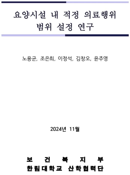 보건복지부가 한림대학교 산학협력단에 의뢰해 수행한 「요양시설 내 적정 의료행위 범위 설정 연구」 보고서에서는, 요양시설의 기능을 생활 돌봄에 국한하지 말고, 간단한 의료행위까지 포함하는 통합적 돌봄 공간으로 확대해야 한다는 내용을 담고 있다. 특히 의사의 지시 하에 간호사가 수액 주사나 도뇨관 교체, 혈액검사 등 경미한 의료행위를 수행할 수 있도록 법적 제도 개선이 필요하다고 강조한다.
