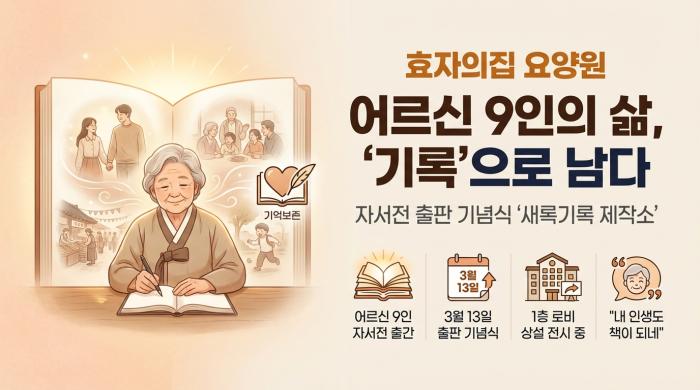 누군가의 어머니로, 혹은 이름 없는 노동자로 묵묵히 시대를 견뎌온 어르신들의 삶이 한 권의 책으로 세상에 나왔다. 호서복지재단 효자의집 요양원(원장 김동욱)은 오는 2026년 3월 13일 오후 2시, 요양원 지하 강당에서 어르신 9인의 생애 이야기를 담은 자서전 출판 기념식 ‘새록기록 제작소’를 개최한다.
