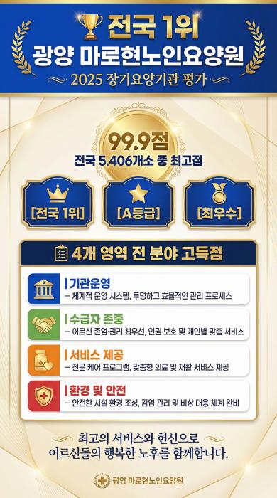 광양시 위탁시설인 마로현노인요양원이 국민건강보험공단 주관 '2025년 장기요양기관 평가'에서 전국 시설급여 기관 5,406개소 가운데 당당히 1위를 차지했다. 광양시는 마로현노인요양원이 최고점수인 99.9점을 기록하며 최우수 등급인 A등급을 획득했다고 5일 밝혔다.